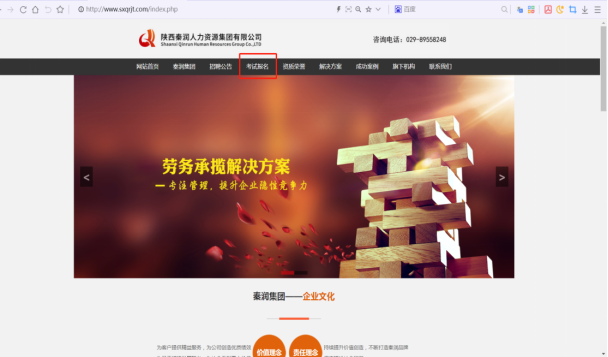 1.登錄陜西秦潤人力資源集團(tuán)有限公司官網(wǎng)(網(wǎng)址:http://www.htmei.com/),點(diǎn)擊“考試報(bào)名”。